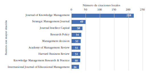 La producción en las 10 principales fuentes corresponde a 31 ponencias de la European Conference on Knowledge (ECKM), 7 artículos de la revista Technological Forecasting and Social Change, 6 ponencias de la International Conference on Intellectual Capital, Knowledge Management and Organisational Learning (ICICKM), 4 documentos del Managing School Intellectual Capital for Strategic Development: Lessons from Asia and Europe, y 3 documentos de los Advances in Intelligent Systems and Computing, ASEE Annual Conference and Exposition, de la Conference Proceedings, de la IOP Conference Series: Earth and Environmental Science, del Journal of Knowledge Management, del Journal of Physics: Conference Series y del Journal of Physics: Conference Series, respectivamente.