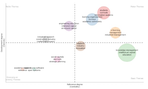 Adicionalmente, en el mapa temático (Figura 5), se evidencia la existencia de temas motor que impulsan la investigación como la articulación con el aprendizaje organizacional: la educación oferta un bien meritorio que se enriquece desde el aprendizaje organizacional con un alto potencial en la generación de resultados económicos (Roy et al., 2019), además reconoce cómo la gestión del conocimiento influye en los procesos de enseñanza y aprendizaje (Tejedor de León, 2016) para la generación de capacidades de manera acelerada (Hsu & Fang, 2009), con impactos en el currículo (Alghail et al., 2023, p. 388). Esto permite demostrar que el CI no se limita únicamente a la investigación, sino que es un tema estratégico y trasversal a los procesos que se adelantan en la academia.
