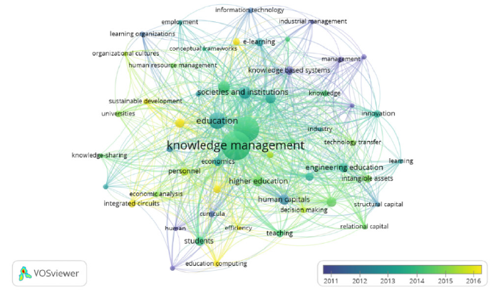 Por otra parte, en la evolución del tema se puede observar que la investigación se concentra en el periodo 2011-2016 en el rol en la educación superior asociado de forma directa o indirecta con la calidad (Handzic & Ozlen, 2011), la relación del capital intelectual y el e-learning, por el potencial que esta posee para hacer cambios estructurales en el sistema (Kçdzierska & Wnçk-Gozdek, 2015, p. 253), la búsqueda de la eficiencia en el aula (Sivagami & Umamaheswari, 2019, p. 3966), las decisiones tomadas desde los informes que se emiten para explicar el comportamiento del CI en términos de productividad y eficiencia (Bellucci et al., 2021, p. 15) y la vinculación con temas de desarrollo sostenible (Alghail et al., 2023, p. 390), que retoma las lecciones aprendidas del sector empresarial para aprovechar los beneficios de gestionar el CI (Sánchez & Elena, 2006) como un soporte para la toma de decisiones en expansión y diversificación (Bocean, 2010). En concreto debe haber un reporte de los resultados a los grupos de interés que, aunado a los estados financieros, explique el valor que se genera a la sociedad, desde el CI y la gestión del conocimiento.