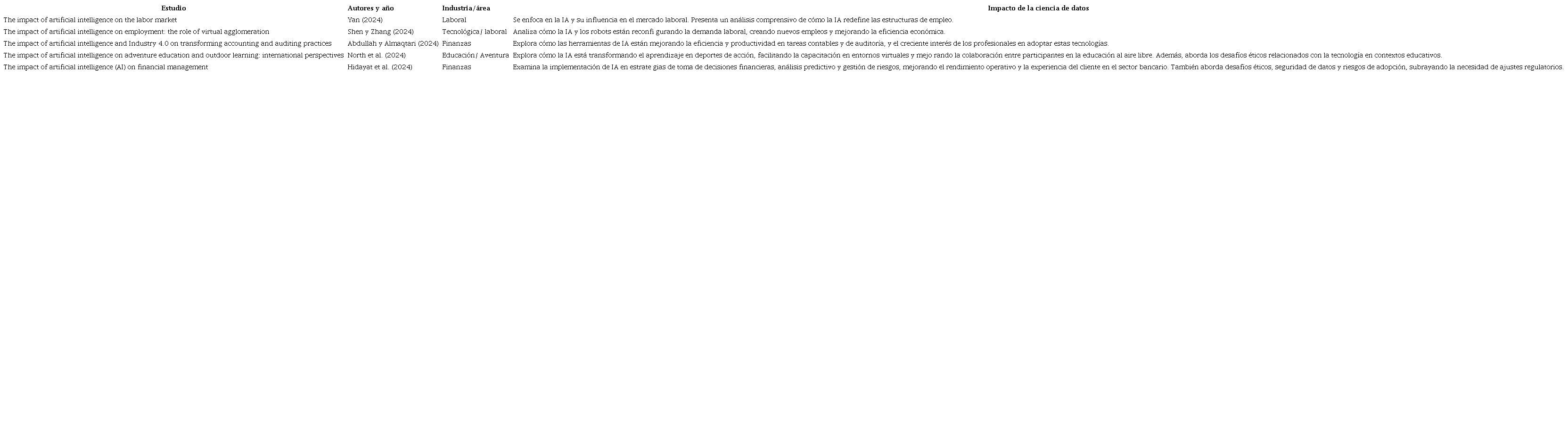Para proporcionar una comprensión clara de los desarrollos más recientes en la inves tigación sobre la conexión entre el talento en ciencia de datos y la productividad, hemos recopilado en la tabla 1 una colección de estudios actuales y destacados en este ámbito. Exploran diversas perspectivas que van desde la integración de IA en las empresas hasta los impactos del análisis de grandes cantidades de datos en la eficiencia operativa. Estos hallazgos ayudan a contextualizar los resultados presentados en este trabajo y reflejan cómo la IA está transformando estrategias de crecimiento empresarial y mejorando el rendimiento socioeconómico en varios sectores (Pirvu et al., 2024).