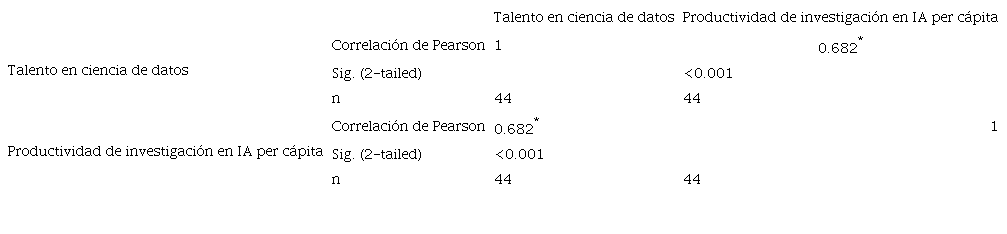 La investigación empírica nos reveló una correlación positiva estadísticamente significativa entre el talento en ciencia de datos de un país y su productividad de investigación en IA per cápita. El coeficiente de correlación de Pearson se determinó en 0.682 (n = 44) y mostró una asociación fuerte y positiva entre las dos variables. Esta correlación fue significativa al nivel 0.01 (bilateral), con un valor de p menor a 0.001, lo que sugiere una probabilidad menor al 0.1 % de que esta correlación sustancial pudiera deberse al azar, como se muestra en la tabla 3.