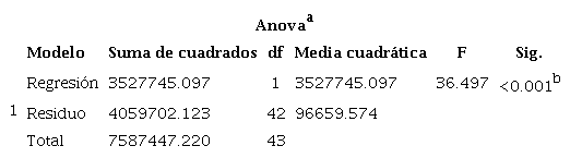 Al establecer los grados de libertad (df) de la regresión en 1, se está considerando solo un predictor, que es el talento en ciencia de datos. Los grados de libertad residuales, calculados en 42, se derivan restando el número de parámetros estimados del total de observaciones. Los valores de cuadrados medios, esenciales para calcular el estadístico F, afirman el ajuste del modelo.