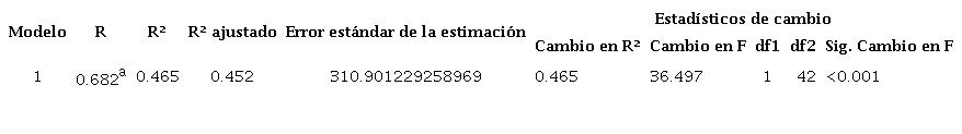 Detalles estadísticos adicionales sobre la eficacia predictiva del modelo, como el R², el R² ajustado y el error estándar de la estimación, se proporcionan en la tabla 5. Un R² de 0.465 sugiere que casi la mitad de la varianza en la productividad de investigación en IA per cápita es explicada por el modelo. Al ajustar este valor (R² ajustado) se reduce ligeramente a 0.452 para considerar el efecto de tener un solo predictor. El error estándar de la estimación de aproximadamente 310.90 refleja la desviación promedio de los valores observados con respecto a las predicciones del modelo.