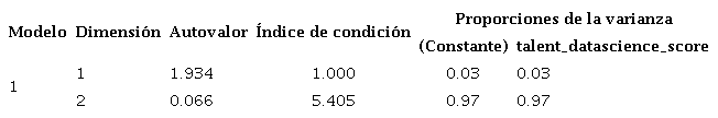 Las proporciones de varianza también respaldan esta conclusión. Para el término cons tante y el talent_datascience_score, las proporciones de varianza en la primera dimensión fueron ambas de 0.03, lo que indica que una cantidad insignificante de colinealidad está presente con otras variables. En la segunda dimensión, tanto la constante como el talent_datascience_score exhibieron proporciones de varianza de 0.97 que, aunque altas, se esperan para el término constante y no sugieren ningún problema con la variable independiente.