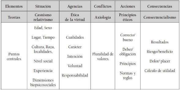 Dado el interés de la toma de decisiones, se identifican los elementos que intervienen en ella y las teorías éticas que pueden fundamentar cada paso para seguir en un proceso deliberativo, así: