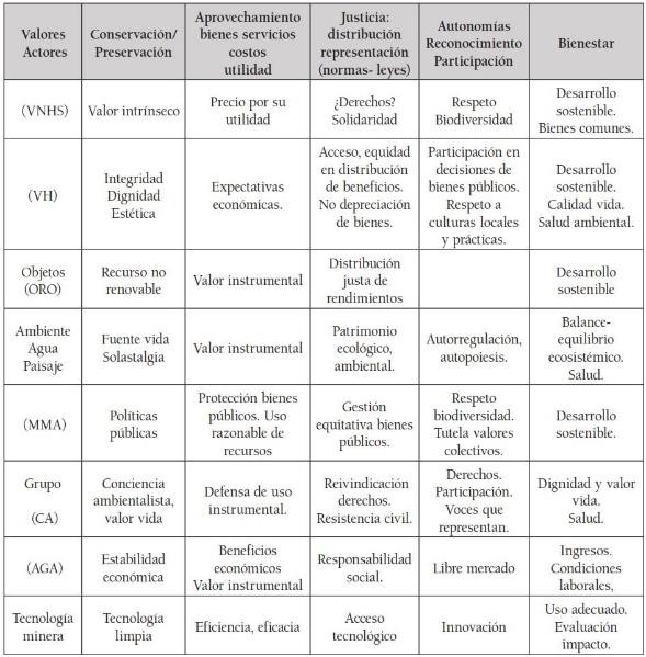 En las deliberaciones en torno a los dilemas ambientales, dice Latour[40], preferimos expresar los valores a manera de localizadores[41], pues permiten situarnos en los distintos contextos e identificar las acciones e interacciones que generan conflictos, como, esto es a los asunto ambientales es necesario entrever los nexos con los aspectos económicos, las condiciones ecológicas y los asuntos culturales tal como lo propone Escobar[42]. Hablar de valores, remite a prácticas, además de deberes-obligaciones, de los actores en conflicto, tales como la conservación de la diversidad, el aprovechamiento de los bienes y servicios, la distribución equitativa de los beneficios, el respeto y reconocimiento de las diversidades, y la representación de los actores involucrados.