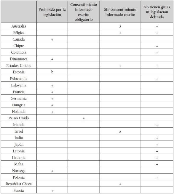 La ESP, que ha aumentado en el mundo en los últimos años, ha suscitado la discusión en torno a sus elementos legales y éticos, como puede verse en trabajos como los de Epker, Groot y Kompanje[8], y Orr y Siegler[9]. En la mayoría de los países no se tiene una legislación especial y solo en Australia, Reino Unido, Estados Unidos, Israel y República Checa, está permitido en casos especiales y/o con consentimiento informado escrito (Véase tabla 1). En Colombia, no existe una ley específica que regule el derecho constitucional de procreación «con asistencia científica»[10]. En el caso de ESP no se determina específicamente a quien se delega esta función.
