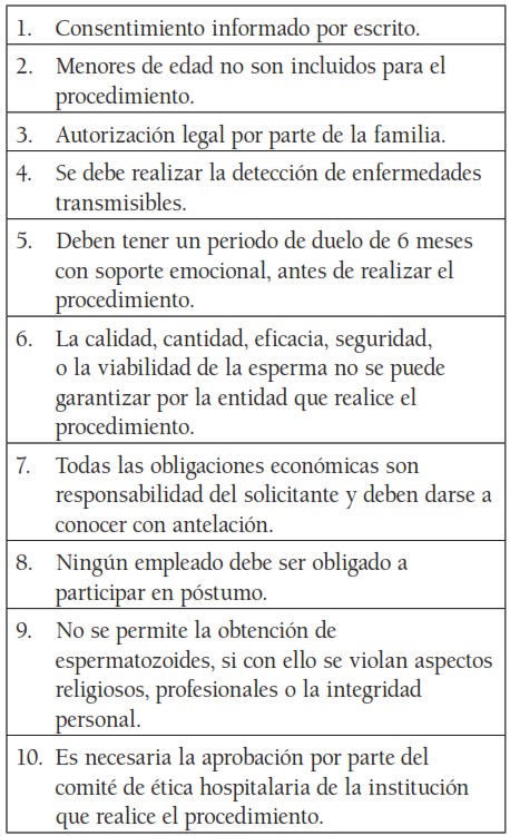 En el Comité de Ética Hospitalaria, recomendamos seguir el protocolo establecido por Batzer (véase tabla 2) que se considera idóneo para el contexto social de nuestro país. Dicho protocolo fue modificado para que se incluya el concepto del comité ético hospitalario del centro de salud en donde se pretenda hacer el procedimiento.