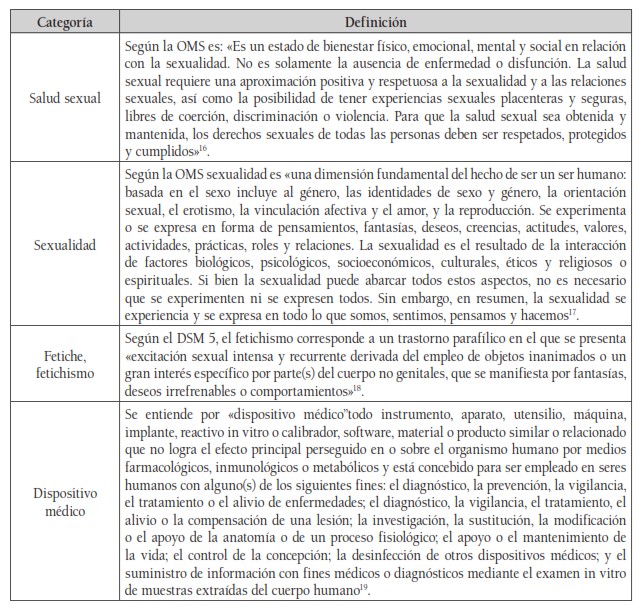 Asimismo, se escogieron aquellos artículos que además de los elementos científicos o clínicos ofrecían contenidos adicionales sobre la perspectiva bioética y sexológica de las sexualidades contemporáneas. Se excluyeron las referencias que no se ajustaban al esquema convencional de artículo IMRAD y aquellas publicaciones en idiomas diferentes al español, inglés o portugués. También se omitieron las publicaciones que se planteaban como discursos de odio o incitaban -directa o indirectamente- a la violación de los Derechos Humanos y los Derechos Sexuales. El periodo de búsqueda de la información por el investigador se dio entre mayo y septiembre de 2015. En los buscadores se escogieron las áreas de salud, ciencias sociales y humanas. Se hicieron búsquedas avanzadas y de hallazgos similares con entradas como sexualidad, humanismo, post-, transhumanismo, fetiche, prótesis, dildo, biopolítica y bioética, en inglés y español[14]. Las categorías de entrada son salud sexual, sexualidad, fetiche y dispositivo médico (véase cuadro 1).