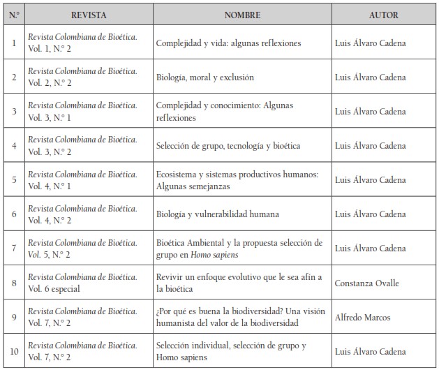 Vale la pena resaltar que uno de los autores con mayor número de publicaciones a lo largo de la trayectoria de la RCB ha sido el investigador colombiano Álvaro Cadena, quien plantea un enfoque diferente y alternativo de carácter biológico y holístico que permite trascender los valores, la moralidad, la exclusión, la complejidad de la vida en un panorama cercano entre la evolución y la bioética. Así mismo, analiza la selección de grupos como un comportamiento de adaptación frente a la selección natural. Cadena realiza una crítica frente a las éticas ambientales que se han orientado con una fundamentación por la fe en sí misma, mientras que propone presentar a la comunidad científica una bioética ambiental con una mirada de selección de grupos como fenómeno de la selección natural y proceso innato de los Homo sapiens: