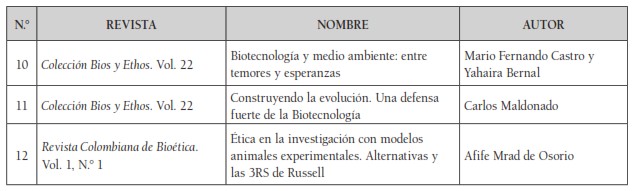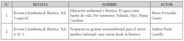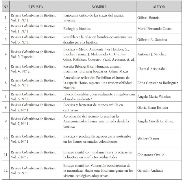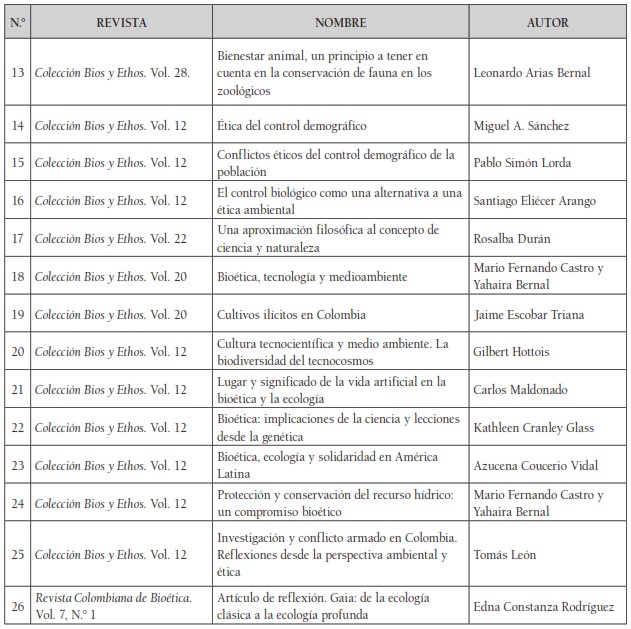 Al realizar la revisión de 183 artículos, se encontraron 52 relacionados con la categoría de bioética ambiental. Para fortalecer la investigación se tuvieron en cuenta quince artículos de la colección Bios y Ethos, en los cuales se promovió en su mayoría la discusión del bienestar animal, los dilemas éticos de situaciones biopolíticas como los cultivos ilícitos y el problema de falta de control demográfico, que son causas de deterioro y emergencia ambiental.