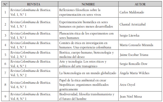 Uno de los principales hallazgos es que los artículos propuestos en esta tendencia son de reflexión y en menor porcentaje productos de investigación. Aquellos plantean posturas bioéticas frente a la manipulación de organismos vivos, así como los retos éticos y políticos del desarrollo tecnocientífico en el panorama actual. Los hallazgos relacionados con biotecnología, en su totalidad relacionados con experimentación en seres vivos son los siguientes: