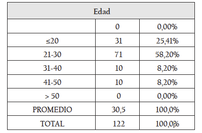 La investigación contó con una revisión teórica sobre los conceptos de moral, ética y bioética. Así mismo, se utilizaron las herramientas de cuestionario autodiligenciado abierto y cerrado cuantitativo, y abierto cualitativo, con el fin de hacer sondeo de opinión. Se basó en una muestra aleatoria de 122 personas, de la ciudad de Bogotá, con promedio de edad de 30,5 años (véase Tabla 1). La muestra estuvo compuesta de 57 hombres (46,72%) y 65 mujeres (53,28%).
