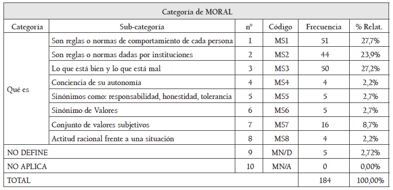 Respecto a las personas que respondieron qué es la moral, se obtuvieron los resultados de la Tabla 2, en la que se muestran las categorías y las frecuencias y porcentajes de participación correspondiente.
