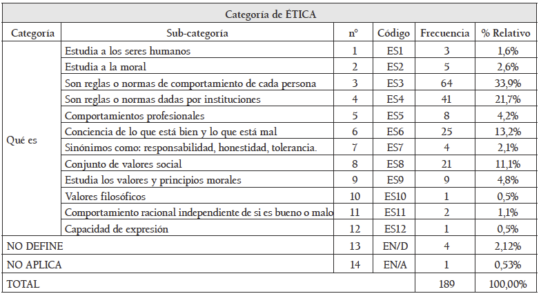 Respecto a las personas que dieron una definición de qué es ética, se obtuvieron los resultados de la Tabla 3, en la que se muestran las categorías, y las frecuencias y porcentajes de participación correspondiente.