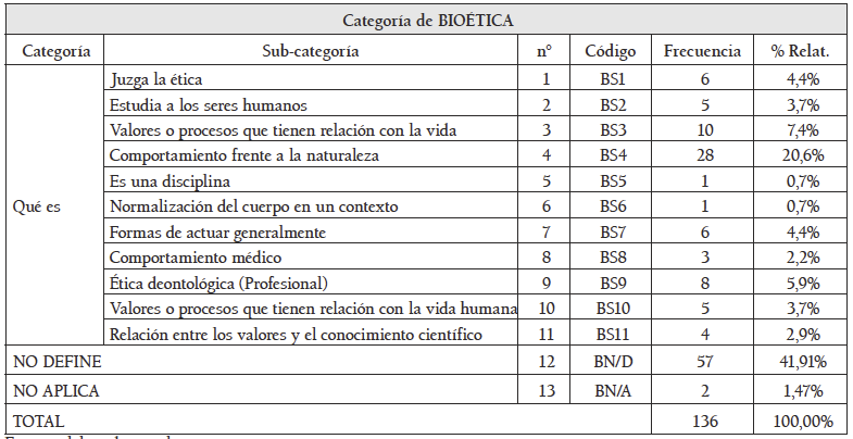 Respecto a las personas que dieron una definición de bioética, se obtuvieron los resultados de la Tabla 4, en la que se muestran las categorías, y las frecuencias y porcentajes de participación correspondientes.