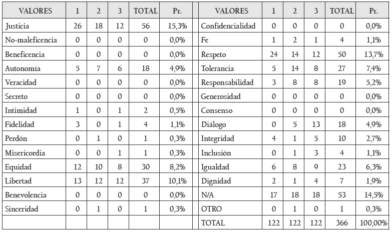 Los resultados se encuentran íntimamente ligados con la percepción que tienen las personas sobre la sociedad actual; estas consideran, en su mayoría, que ésta se encuentra en una situación regular (61,48%) en cuanto al nivel ético, al parecer porque se usa como sinónimo de moral. No obstante, cuando se pregunta sobre el papel del respeto a la autonomía individual el 65,57% de los entrevistados está de acuerdo con ejercer este deber-derecho como un valor fundamental en una sociedad. Y en correspondencia con ello, entre los valores más importantes para la construcción de una sociedad pacífica, se encuentra en primer lugar la justicia (15,3%), seguido por la autonomía-libertad (15%), y en tercer lugar se encuentra el respeto (10,1%). Los demás puestos se encuentran repartidos entre intimidad, fidelidad, perdón, misericordia, equidad, sinceridad, fe, tolerancia, responsabilidad, diálogo, integridad, inclusión, igualdad, dignidad. Sin embargo, los tres principales componentes, se corresponden con los principios o valores promulgados por la bioética.