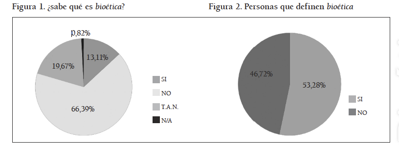 A pesar de lo anterior, cabe notar que no sucede lo mismo con el concepto de bioética. Aunque el término haya sido acuñado desde 1970, este no ha permeado lo suficiente en la mente de las personas del común, lo cual se evidencia en que el 69,39% dice no saber qué es la bioética, mientras que entre los que dicen saber qué es o por lo menos tener alguna noción solo alcanzan a sumar 32,79% (13,11% y 19,67% respectivamente), menos de la mitad de los que dicen no saber. No obstante, es importante aclarar que 53,28% de los entrevistados se aventura a dar una definición de bioética. Empero, la revisión cuidadosa de las definiciones dadas por los participantes muestra que estas son guiadas por su relación etimológica, es decir, hacen la descomposición de la palabra en bios y ética, y así llegan a postular que es una ética relacionada con la vida, aunque no planteen claramente cómo es esto. Así mismo, 20,6% de las respuestas (la más alta) plantean que tiene que ver con el comportamiento que debemos tener hacia la naturaleza, hacia el medio ambiente. Adicionalmente, sólo 2,9% señala la relación entre el conocimiento científico y los valores morales; y 2,2% hablan de la relación ética y medicina.