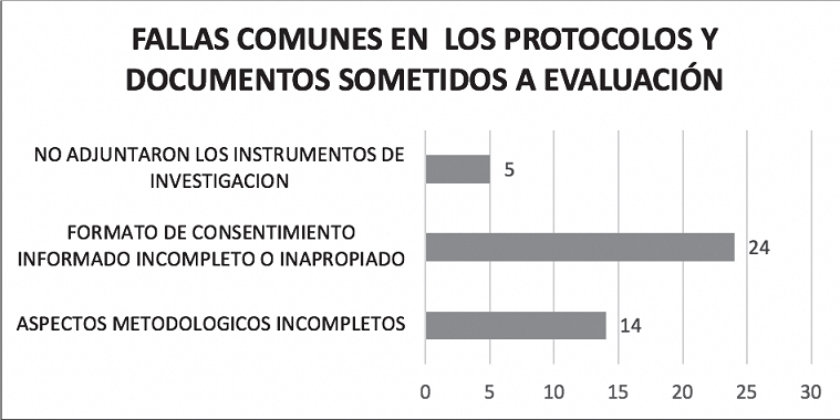 En la figura 2 se ilustran las fallas más comunes en los protocolos y documentos sometidos a evaluación.