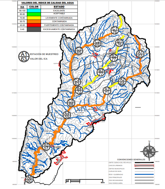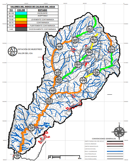 Como se puede observar, las aguas de todos los ríos estudiados en la cuenca del río Apulo presentan valores de los ICA inferiores a 90, tanto en el período de aguas altas como de aguas bajas. Los ríos estudiados presentan, en su mayor parte, valores de los ICA de 70 o menos, lo que de acuerdo con la clasificación para aguas potables que establece el ICA, se trataría de aguas contaminadas, con excepción del río Bahamón (que es el de menor afectación de los ríos estudiados) y las cabeceras de los ríos Curí y Apulo, entre las estaciones A1 y A2.