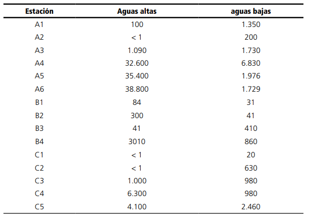 elaboración propia.Como se observa en la tabla, la contaminación por materia fecal es generalizada en todas las estaciones de muestreo, desde las cabeceras hasta las desembocaduras de los tres ríos. Si bien, en la época de aguas altas algunas estaciones de muestreo presentan valores de concentraciones menores a uno (estaciones A2, C1 y C2), no quiere decir que no haya presencia de bacterias coliformes fecales, por lo que el consumo directo del agua en estos ríos no es permisible, sin un tratamiento de desinfección primario.