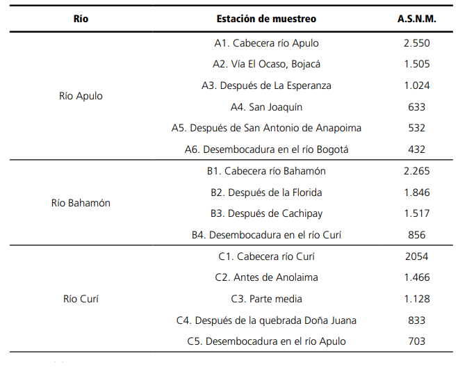 Se determinaron 15 estaciones de muestreo, de acuerdo con criterios sobre la localización de las poblaciones, número de subcuencas y actividades agrícolas y pecuarias, de manera que abarcaran toda la cuenca del río Apulo, desde sus cabeceras hasta su desembocadura en el río Bogotá (ver tabla 1 y figura 2).