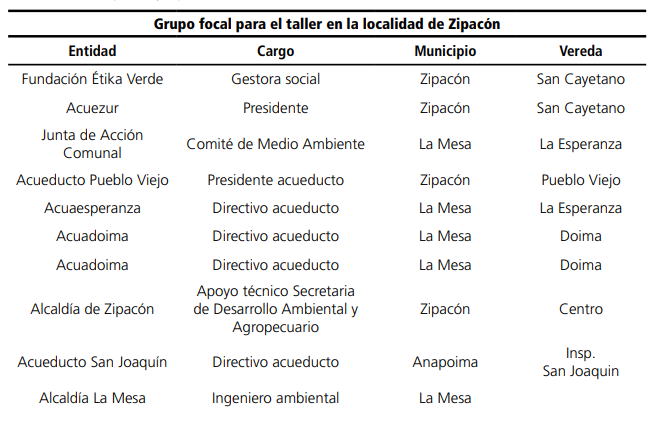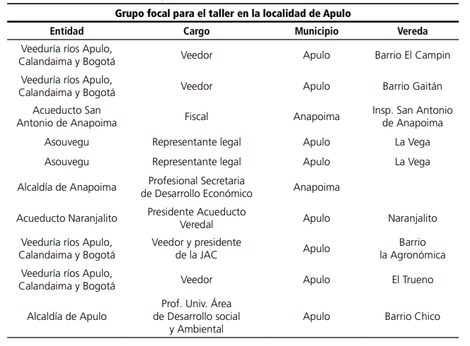 Para la realización de los talleres de cartografía social, se contactaron los alcaldes de seis localidades de la cuenca del río Apulo, Zipacón, Cachipay, Anolaima, La Mesa, Anapoima y Apulo. Con ellos se establecieron los contactos para la conformación de los grupos focales.
