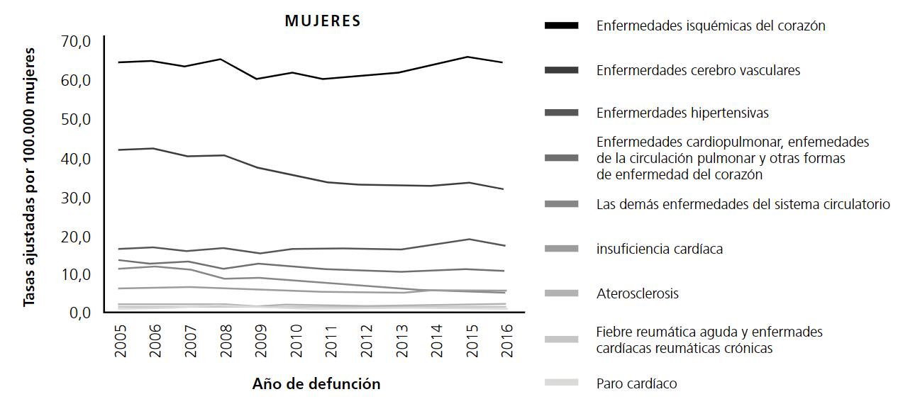 Con respecto al infarto agudo de miocardio, su incidencia global está en declive en todo el mundo y en todos los grupos poblaciones, con excepción de las mujeres jóvenes (Regitz-Zagrosek 2012; Lloyd-Jones et al. 2010; Garcia et al. 2016; Humphries et al. 2017). Es una realidad que esta población no ha sido tenida en cuenta en los programas de promoción y prevención en salud y además, enfrenta un mayor riesgo cardiovascular debido a los cambios en el estilo de vida que las mujeres han experimentado en el último siglo (tabaquismo, aumento del estrés laboral, entre otros). Igualmente, las mujeres jóvenes tienen una mayor tasa de mortalidad después del primer infarto cardiaco que los hombres en el mismo grupo de edad (Regitz-Zagrosek 2006; 2017).