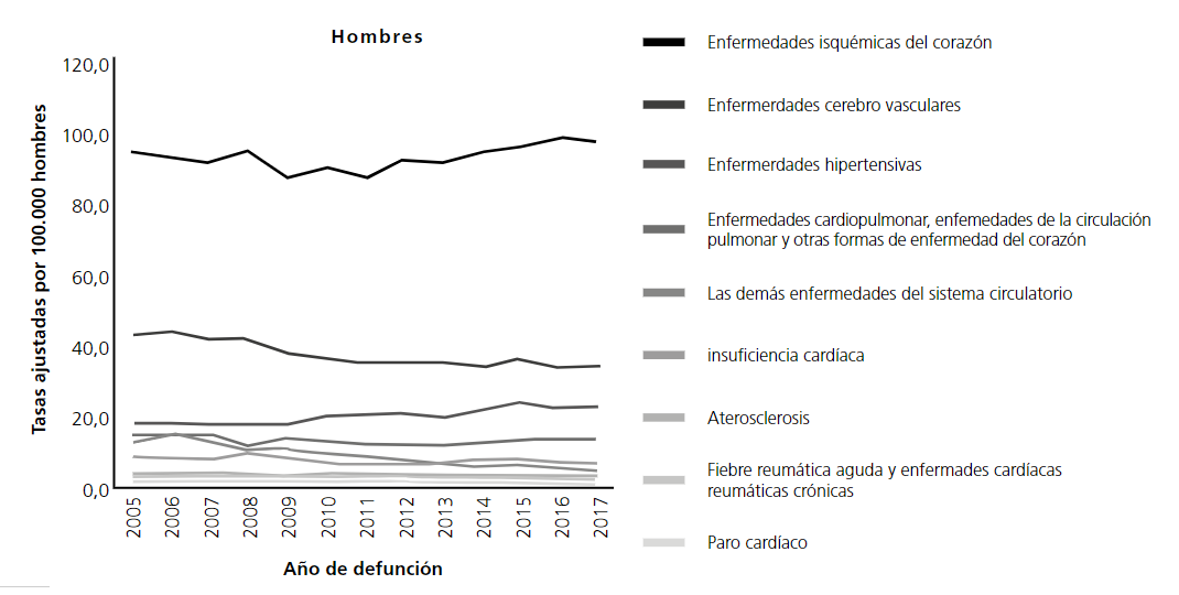 La enfermedad coronaria o el infarto agudo de miocardio es una enfermedad altamente prevalente en la población mundial y es una de las principales causas de muerte. En Colombia (figura 1) es la principal causa de muerte tanto en mujeres como en hombres (Ministerio de Salud y Protección Social 2018).