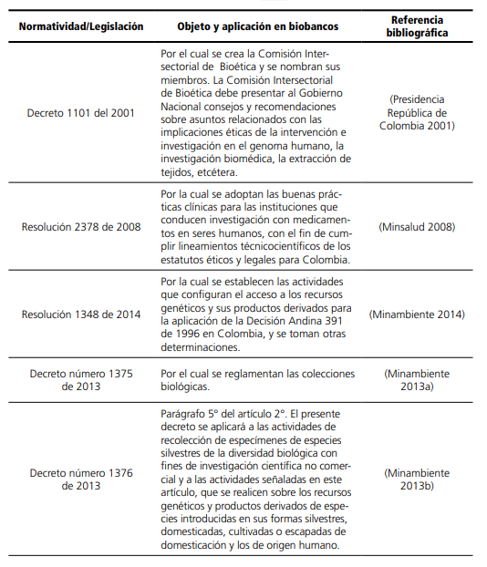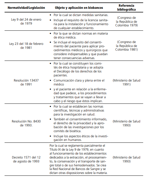 En Colombia existen legislaciones relacionadas con la ética en la práctica médica, con los derechos de los pacientes y sobre los sujetos que participan en investigaciones científicas, pero no existe normatividad específica para biobancos dedicados a recolectar y almacenar muestras con fines de investigación. Sin embargo, sí existen normas colombianas que regulan los bancos de sangre, los aspectos éticos y legales de las investigaciones en seres humanos, el derecho a la privacidad y el consentimiento informado, que podrían aplicarse al establecimiento e implementación de los biobancos (Veloza Cabrera et al. 2010). En la tabla 1 se incluye la normatividad y legislación vigente asociada a los biobancos y las colecciones de muestras en Colombia.