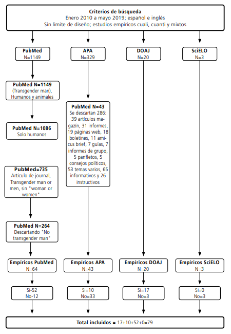 En todas las bases se usaron los mismos términos de búsqueda cambiando los items particulares de cada base. En el caso de PubMed, se buscaron documentos sobre humanos descartando por especies y otros animales, con los términos “Transgender man [or] Transgender men [not] Transgender woman [or] Transgender women”. Luego “[Not] Transgender man” y retirando los documentos no empíricos. Para la base APA se usaron los mismos términos, es decir: “Transgender man [or] Transgender men [not] Transgender woman [or] Transgender women”, descartando aquí documentos tipo magazin, reporte o informe, páginas web, boletines de noticias, amicus brief, guías, informes de grupo, panfletos, consejos políticos, notas de temas varios, informativos e instructivos, revisiones de literatura o sistemáticas, opinión de expertos, reflexión, o documentos referidos directamente a la mujer transgénero. Para la base Directory Open Access Journals (DOAJ), se usaron los mismos términos para buscar artículos empíricos y descartando revisiones. Finalmente, para la base de datos de SciELO, se usaron los términos pero se descartaron, además, guías de práctica clínica y documentos reflexivos (figura 1).