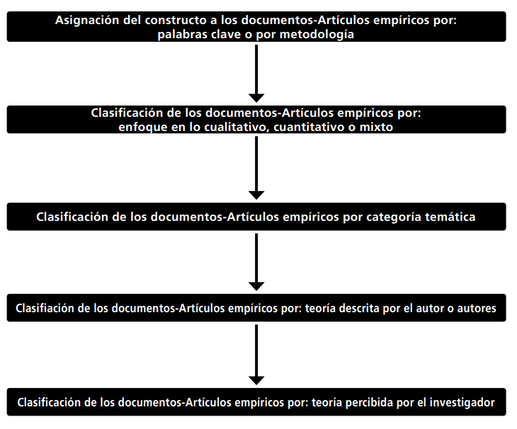 Se adicionó una estrategia metodológica propia que incluyó la lectura del resumen del artículo seleccionado, para clasificarlo por tema emergente, con verificación del contenido completo del documento. Las palabras clave descritas en cada artículo y los términos sobre el contenido conceptual del artículo fueron empleados como constructos para la búsqueda temática de los soportes teóricos, en Google Scholar, de sus autores, año de divulgación, independientemente de su saber o disciplina. Se verificó duplicidad o el parecido del nombre de la teoría con otras teorías relacionadas, por autores, año de publicación, fuente, país de procedencia y significado de la teoría elegida, dando lugar a una matriz de almacenamiento con esta información (figura 2).
