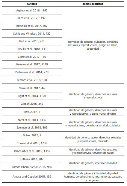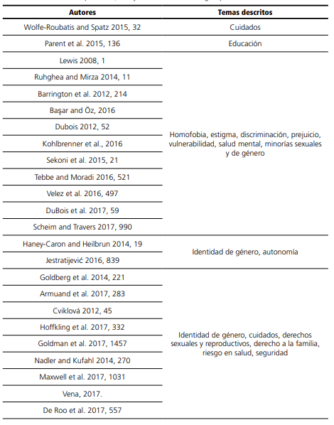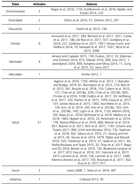 La categorización temática correspondió a 50 artículos de salud, 3 de discriminación, 9 de identidad, 9 de familia, 1 de educación, 2 de diversidad, 2 sociales, 1 de violencia y 1 de mercadeo (tabla 1).