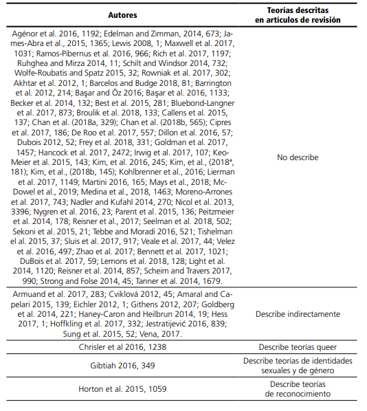 De los 79 artículos hay ausencia de fundamento teórico en 83,5 % (69/79) de la publicaciones; en el 15,2 % (12/79) se describe ese fundamento de manera indirecta y en el 3,85% de forma explícita. Estos últimos, lo que hacen explícitos sus fundamentos se refieren a las teorías queer(Chrisler et al. 2016, 1238), a las teorías de identidad sexual o de género (Gibtiah 2016, 349) y a las teorías de reconocimiento (Horton, Rydstrøm y Tonini 2015, 1059). Al respecto, en la tabla 2 se incluyen los autores, el año de publicación y las teorías descritas en cada artículo que se incluye en esta revisión.