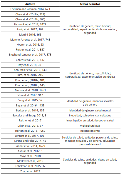 Method/Approach. We conducted a qualitative narrative literature review under a research objective and question, bibliographic search, study retrieval, systematization, selection, database construction, primary analysis, evaluation, and analysis by topic. The review encompasses empirical studies of transgender men in Spanish and English published in Pub-Med, APA, DOAJ, and Scielo between January 2010 and May 2019, with no design limits. The articles included were classified by emerging theme and by theory, according to their authors.
