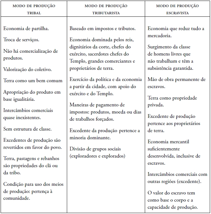 No mundo bíblico podem ser identificados três modos de produção: (1) o tribal; (2) o tributário; (3) o escravista. O quadro abaixo resume os três modos de produção: