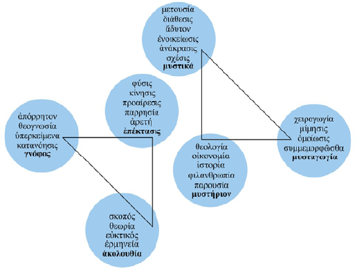 The conceptual framework of the categories μυστικά, μυσταγωγία, μυστήριον, ἐπέκτασις, γνóφος and ἀκολουθία, could help us in our efforts to carry out a theological work based on a personal relationship with God. This effort includes all the above mentioned dimensions, because it requires a continual renovating process that goes from Baptism to Eucharist, and is centered in the mystery of the sonship of Christ, that gives us at the same time a correct comprehension of the human mystery, our epistemological possibilities to grasp the mystery and a method of concatenation based on Sacred Scripture.