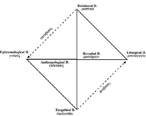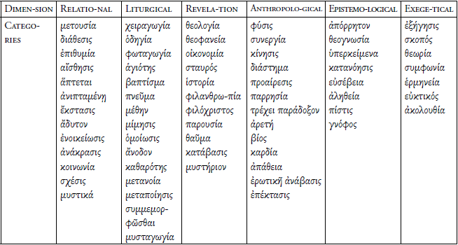 The distribution of categories into groups and theological dimensions responds to the desire of systematizing the theological work of the Nyssen in the two works that are been analyzed. In this order of ideas, the integration between categories and dimensions would be as follows: μυστικά as the relational dimension, μυσταγωγία as the liturgical dimension, μυστήριον as the revealed dimension, ἐπέκτασις as the anthropological dimension, γνόφος as the epistemological dimension, and ἀκολουθία as the exegetical dimension.