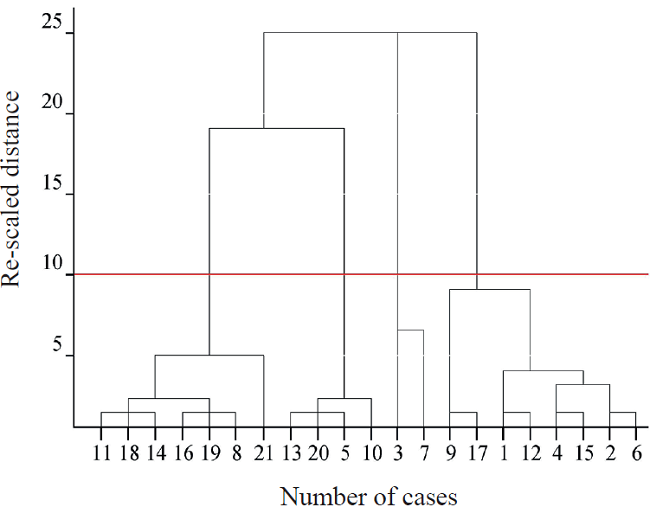 The fact that hierarchical and non-hierarchical groupings coincided in the formation of four clusters demonstrates that there was consistency in the resulting grouping, which could be appreciated under the cut line, located in the unit 10 of the re-scaled distance (40%), in figure 1.