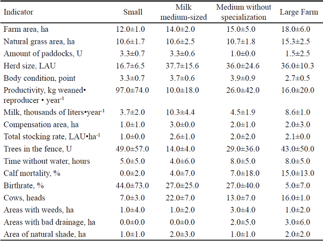 Small farms represent 38.1 % of the sample and mainly dedicate to milk production but have relatively high levels of productivity of meat from reproducers (up to three times superior from the rest of the farms). These farms have subdivisions in the grassland that allow certain regulation of grazing and a herd (total and of cows) that guarantees a proper total stoking rate, which is favorable for guaranteeing the required rest time of grasses and do not affect other productive indicators of grassland and animals.