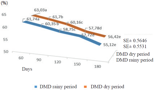 In both seasons, dry matter digestibility decreased (P<0.05) with the increase of age, being 6.62 and 6.61 percentile units in rainy and dry period, respectively (figure 1).