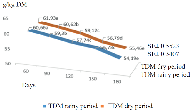 Total digestible nutrients and metabolizable energy of Moringa oleifera foliage decreased (P<0.001) with regrowth age in both seasons, with a decrease of 6.47 and 6.48 g/kg DM and 1.25 and 1.26 MJ/kg DM of metabolizable energy for dry and rainy periods, respectively (figures 2 and 3).