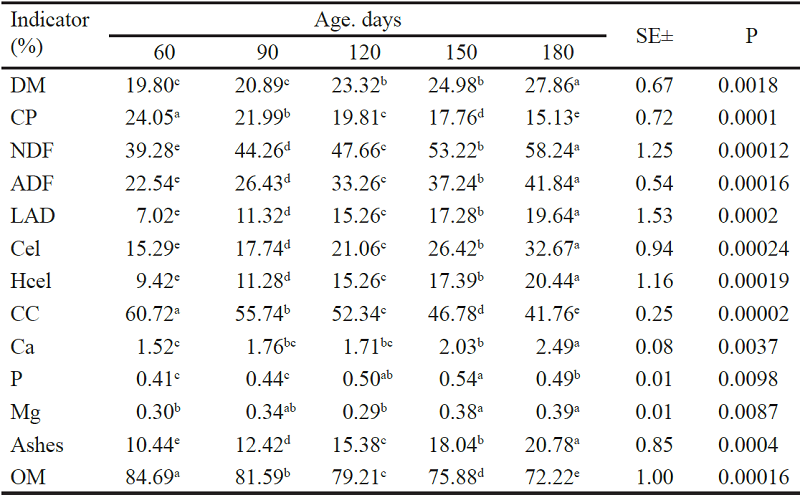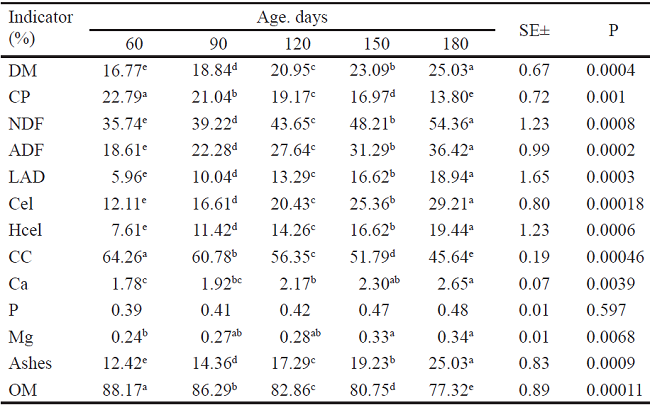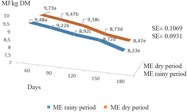 Related to chemical composition during rainy period (table 1), DM, NDF, ADF, LAD, Cel, Hcel, CC, Ca, Mg and ash were increased with age, with values of 8.26, 18.62, 17.81, 12.98, 17.10, 11.82, 0.87, 0.10 and 12.61 percentile units, respectively. CP, CC and OM decreased in 8.99, 18.62 and 3.85 percentile unit, respectively. There were significant differences (P<0.05) among the studied ages for each of the indicators, except for phosphorus.