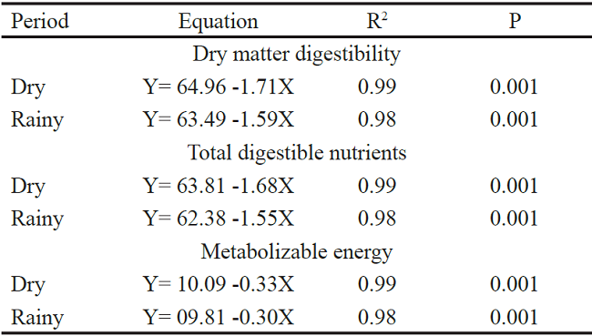 Linear regression equations among digestibility, energy and total digestible nutrients indicated the marked effect of regrowth age in this plant to present high coefficients of determination with high precision. In addition, the little variability of coefficients of expressions in both seasons was significant, as well as the similarity among slopes. This could indicate the favorable response of this plant to low rainfall during dry season and a priori be considered a plant with a certain tolerance to drought.