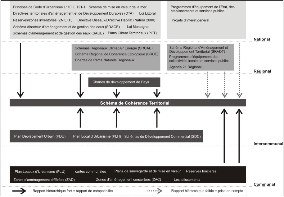 En France, depuis les lois de décentralisation, les territoires sont fortement imbriqués, au point qu’un projet d’aménagement peut interférer avec plusieurs échelons territoriaux, d’autant qu’il n’y a pas de hiérarchie au sein des différentes collectivités, ni forcément de priorité d’actions (Plottu & Plottu, 2009). Cependant, un principe de hiérarchie de systèmes de décideurs existe et conditionne fortement les projets locaux grâce au “principe de tutelle” (Plottu & Plottu, 2009). En effet, les accords internationaux et les lois nationales priment sur les outils stratégiques et d’aménagement régionaux, intercommunaux ou communaux. Une hiérarchie des normes s’impose en conséquence.