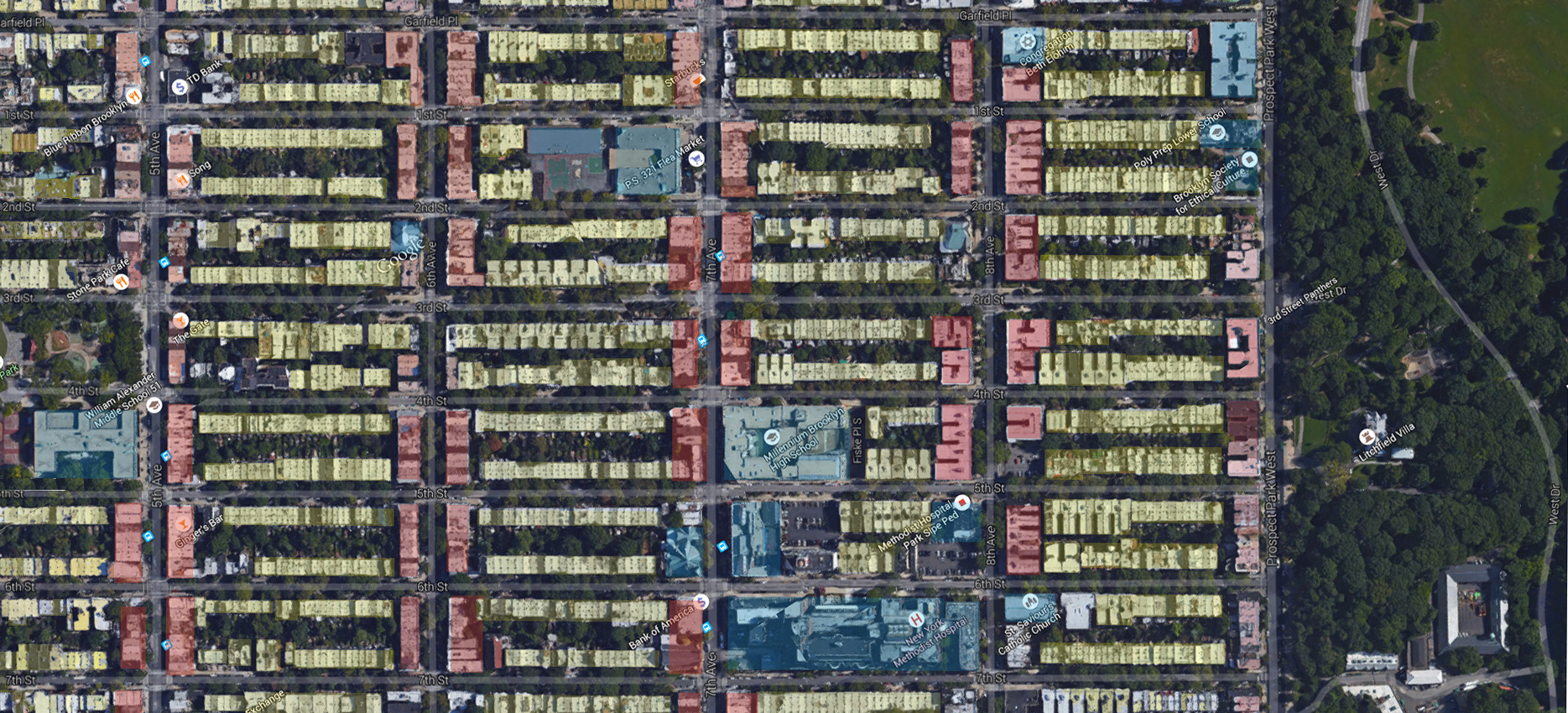 Com frente para as menores faces das quadras, paralelas à Avenida Prospect Park West, as avenidas apresentam uso misto com comércio no térreo e serviços ou habitações nos andares superiores. Apesar da alteração de uso, os edifícios das avenidas têm volumetria compatível com a dos prédios de habitação dispostos nas ruas e arrematam formalmente a quadra, mantendo o gabarito.