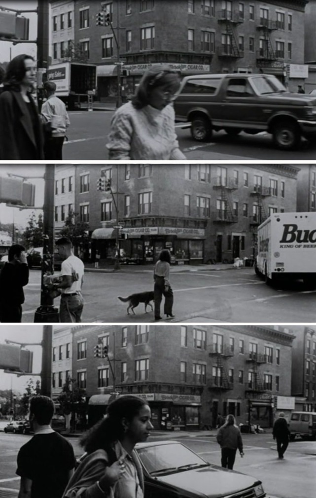 Sua fala instiga a buscar diferenças de luz, a chuva e o sol, o verão e o inverno, o dia de semana e o fim de semana. Somadas a essa geovariação, as fotos exibem, principalmente, as pessoas que habitam aquele lugar e fazem o registro de sua presença. A fala de Auggie vai, então, descortinar esse movimento humano: às vezes aparecem as mesmas pessoas, outras vezes elas são diferentes. Algumas pessoas diferentes se tornam familiares. Outras frequentam a rua por algum período e depois desaparecem.
