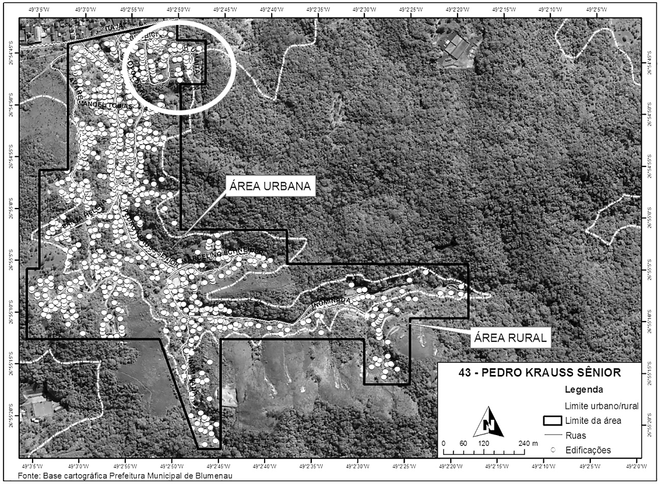 Na comunidade, residem hoje em torno de 800 famílias, distribuídas em área urbana e rural, totalizando 636.755,95 m2 (Blumenau, 2012). Muitos residem em locais acessíveis somente por meio de escadarias. Na Figura 3, é possível ver a distribuição espacial da localidade. A área circulada aponta o local da comunidade, de onde 40 famílias foram retiradas e posteriormente levadas para abrigos municipais (Blumenau, 2008). Os motivos foram deslizamentos ocorridos no dia anterior à transferência (16/11/2008) devido às intensas chuvas que já caíam no município. A retirada foi preventiva, pois, nos dias 22 e 23 de novembro de 2008, o município foi assolado pela maior tragédia já registrada em sua história. Reportagens do dia registravam: “O Flagelo das chuvas: tempo castiga a região” (Waltrick, 2008).