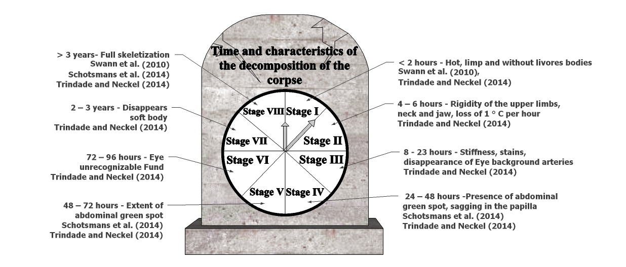 Putrefaction involves several phases; full skeletonization is reached after more than three years (Figure 1) (Swann et al., 2010; Schotsmans et al., 2014; Trindade & Neckel, 2014). Trindade & Neckel (2014) mentioned that the level of liquid and solid contaminants released from a corpse is high from 72 hours up to 3 years after death.