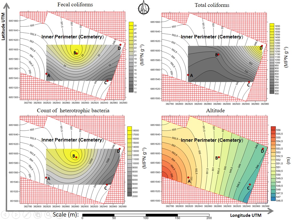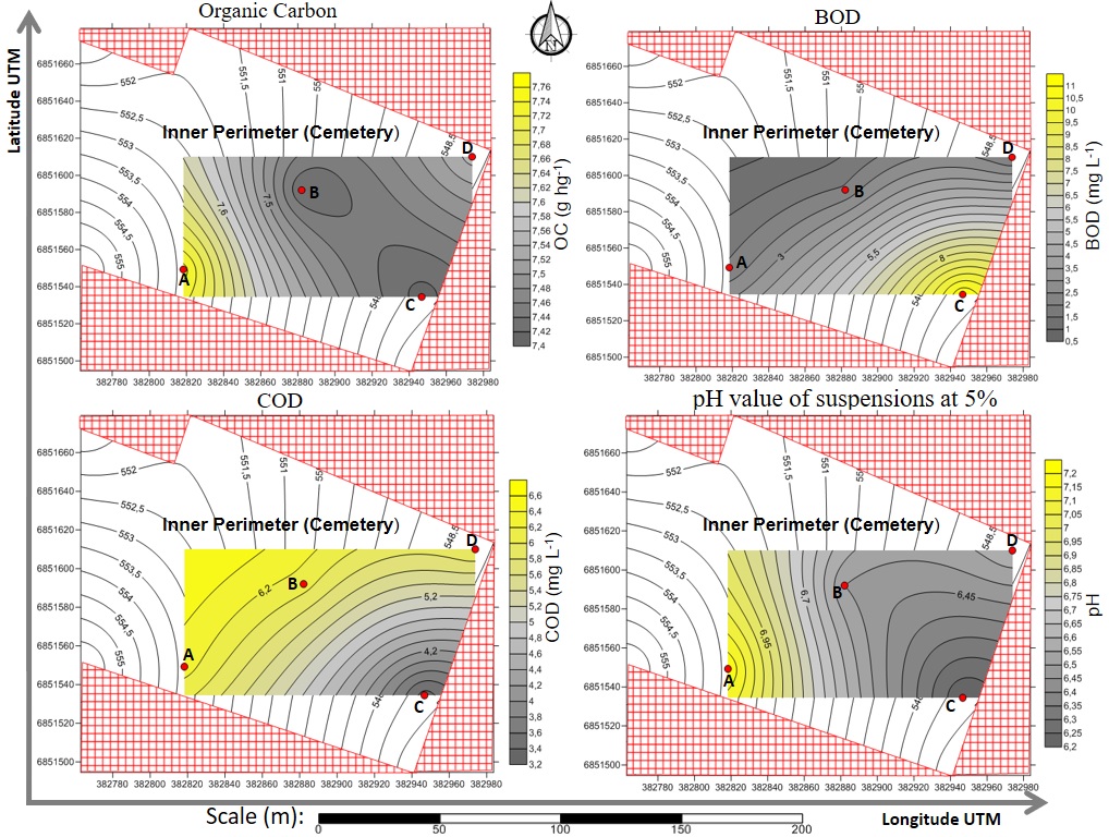In this study, soil samples were collected in loco in the city of Marau’s 3.57 ha Central Cemetery, which has a high density of burials — at some locations points it reaches a third burial layer. Laboratory tests of cemetery soil exposed various contamination risks (Table 2), which should be taken as a warning that further research must be undertaken in other cities in Brazil, as well as in other countries. After analysing the soil samples from the four sampling points (A, B, C and D) in Marau’s Central Cemetery and averaging the three measured values for each site, values were plotted in Surfer 12 software (Figure 2, 3) by interpolating between the four points.